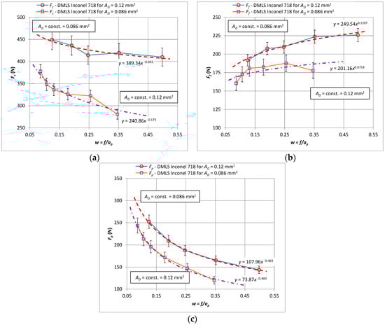 A comparative analysis of the cutting force for the case of increasing values of the cross-section of the cutting layer AD showed an increase of all components, which are characterized by a constant difference between the values. Figure 5 shows the components of the total cutting force Fc, Ff, Fp as a function of the constant cross-section of the cutting layer AD = 0.8 mm2 and AD = 1.2 mm2 when turning the 3D printed Inconel 718 alloy. A decrease in the Fc and Fp components was observed for increasing values of the w parameter. On the other hand, the values of the feed component Ff increase for each value of the section of the cut layer (Figure 5b).