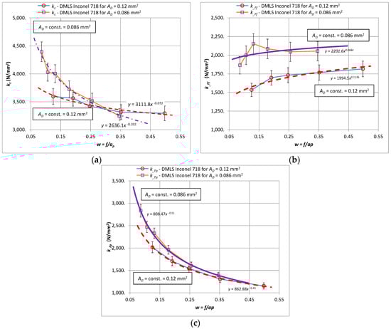 Figure 6 shows the graphs of the specific cutting force kc, k_Ff, k_Fp for the components of the total cutting force Fc, Ff, Fp respectively, when turning laser-sintered material for two values of the cross-section of the cutting layer, i.e., AD = 0.8 mm2 and AD = 1.2 mm2. The specific cutting force kc and kcp decrease with an increase of the parameter w (Figure 5a,c) for both analyzed sections. It should be noted that the values of the specific cutting force for the bigger cross-section AD = 1.2 mm2 are lower for w parameter range <0.3 than for the cross-section with the lower value. For w ≈ 0.3, the values of the specific cutting force kc reach similar values. Above the value of the parameter w ≈ 0.3, the specific cutting force for the cross-section AD = 1.2 mm2 is higher. It seems that by changing the shape of the cross-section of the cutting layer, the turning process can be carried out with reduced specific cutting force values. It is important for the selection of machining allowances and for the implementation of turning, both fine and rough. It should be noted, however, that changing the shape of the surface reduces the volumetric efficiency of the Qv process, which results in an extension of the total cutting time Ttotal.