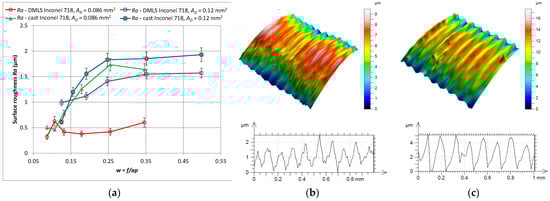 Figure 7 shows the surface roughness profile Ra for turning of the cast and 3D printed Inconel 718 alloy. In all cases, the surface roughness values increased. This is the result of increasing values of the feed f in order to maintain a constant cross-section of the cutting layer, i.e., with decreasing values of the depth of cut ap. It should be noted, however, that when turning laser sintered material, the surface roughness Ra was lower than when turning cast material.