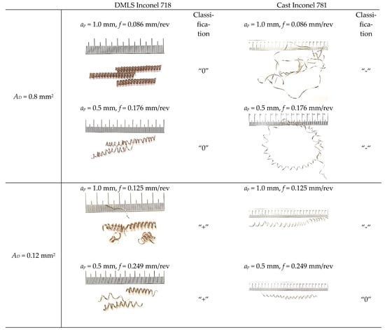 Figure 8 shows examples of photos of chips obtained by turning a laser sintered and cast alloy. In the case of turning the laser sintered alloy, an acceptable chip shape was obtained with a length in the range of Lch = <30; 60> mm. The following chip classification has been adopted: “-”-unacceptable chips with a length of more than 150 mm; “0”-acceptable chips with a length of 30–150 mm and favorable chips “+” with a length of up to 30 mm. The obtained chips were spiral and continuous. A slight change in the chip shape was observed for increasing the feed f. For turning the cast Inconel 718, usually chips were obtained with an unacceptable shape with a length above Lch > 150 mm. The obtained chips had the form of a long, twisted or spiral ribbon. A change in the chip shape from ribbon to spiral was observed for increasing feed f values while maintaining a constant cross-section of the cut layer AD = 0.08 mm2. For a higher value of the cross-section of the cutting layer AD = 0.12 mm2, an advantageous shape of chips was observed when turning the DMLS printed material. In the case of turning cast material, the chips were classified as disadvantageous or acceptable.