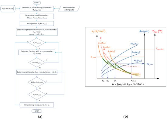 Figure 9 shows a simplified diagram of the procedure algorithm which is used for turning as the method of minimizing the value of the specific cutting resistance kc. The minimization of the kc parameter value is performed taking into account the constant value of the area of cross-section of the cutting layer AD. In turn, the value of the area of cross-section of the cutting layer is determined by selecting the suitable ratio the value of the feed f and the cutting depth ap (schematic presented in Figure 1). The shape of the cross-sectional area of the cutting layer also depends on the corner radius of the cutting insert and the entering angle κr of the applied cutting edge. The method takes into account the optimization constraints as permissible values of specific cutting resistance kc_limit, surface roughness Ra_limit, w_limit, the coefficient describing the ratio of the feed value and cutting depth and the maximum temperature in the cutting zone, Tmax_limit.