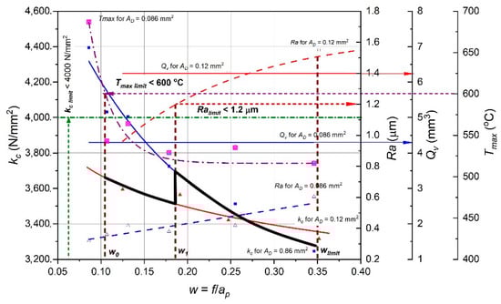 - According to the algorithm (Figure 9), for Tmax_limit = 600 °C, the initial value of w0 = 0.15 was set. For such w0 value the lowest value of the specific cutting force kc is for the cross-section AD2 = 0.12 mm2.
