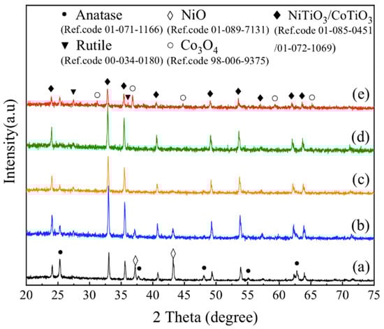 The presence of NiO diffraction peaks indicates that the reaction between NiO and TiO2 is not complete, and there is a surplus of NiO. This might be because the CoTiO3 and NiTiO3 produced by the reaction of the Co and Ni sources with TiO2, respectively, are coated on the surface of the TiO2 microspheres, preventing the further reaction of NiO with TiO2 and resulting in a surplus of NiO. As the amount of Co source increases, the NiO peak gradually disappears. When the Co/Ni molar ratio is increased to 0.9:0.1, as shown in Figure 2e, the diffraction pattern suggests the presence of Co3O4 phase in the product, which could similarly be due to the excess of Co source and the pre-formed CoTiO3 and NiTiO3 on the surface of the microspheres hindering the further reaction of CoO with TiO2. Further oxidation of the remaining CoO at high temperature results in the formation of Co3O4.
