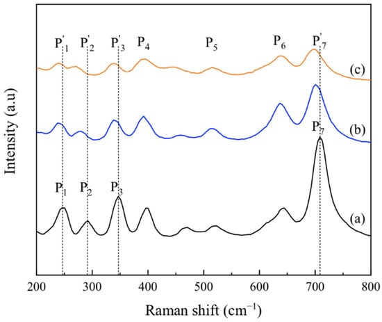 Because the diffraction peaks of CoTiO3 and NiTiO3 are very similar in position, making it difficult to distinguish between the two by X-ray diffraction, the structural properties and phase changes of the samples were further investigated by Raman spectroscopy. Figure 3a–c show the Raman spectra of the products after calcination at 800 °C for samples with Co/Ni molar ratios of 0.1:0.9, 0.5:0.5 and 0.9:0.1, respectively. Seven peaks from P1 to P7 can be observed in Figure 3a. A review of the literature shows that the characteristic peaks of anatase TiO2 are around 637.7, 515 and 396 cm−1 [39], corresponding to the three peaks at P4, P5 and P6 in Figure 3a. The characteristic peaks of NiTiO3 are around 238, 284, 338 and 705 cm−1, corresponding to the peaks at P1, P2, P3 and P7 in Figure 3a [40]. This indicates that when the Co/Ni molar ratio is 0.1:0.9, the product is dominated by NiTiO3. When the Co/Ni molar ratio is increased to 0.9:0.1, peaks P1, P2, P3 and P7 shift to P1′, P2′, P3′ and P7′ in Figure 3c, which correspond to those of CoTiO3 (the characteristic peaks of CoTiO3 are around 237, 266, 335 and 695 cm−1 [9]). It is worth mentioning that, in Figure 3a, the peak near 460 cm−1 corresponds to the characteristic peak of NiTiO3 [40], which can be explained by the fact that when the Co/Ni molar ratio is very low, and the phase in the product is dominated by NiTiO3. As the Co/Ni molar ratio increases, the peak shifts to near 445 cm−1 in Figure 3c, a position that corresponds to the characteristic peak of the rutile phase TiO2 [41]. This is in agreement with the XRD results in Figure 2, where the rutile phase appears in the product when the Co/Ni molar ratio is high, as seen in Figure 2e. The change in the position of the peaks between Figure 3a,c indicates that the product changes from being NiTiO3 dominated to CoTiO3 dominated as the Co/Ni molar ratio increases.