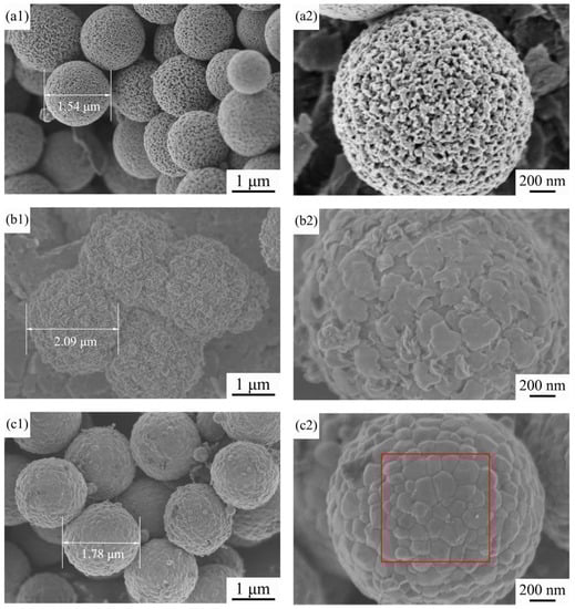 FE-SEM images of (a1,a2) the home-made TiO2 precursor microspheres, (b1,b2) the intermediate microspheres at a Co/Ni molar ratio of 0.5:0.5 and (c1,c2) the composite pigment powder obtained after calcination of the powder in (b1,b2) at 800 °C.