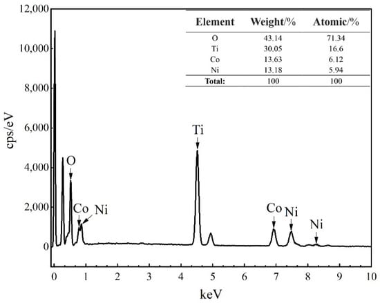 EDS spectrum of products calcined at 800 °C with a Co/Ni ratio of 0.5:0.5 (the analyzed area corresponds to the red box marked in Figure 4(c2)).