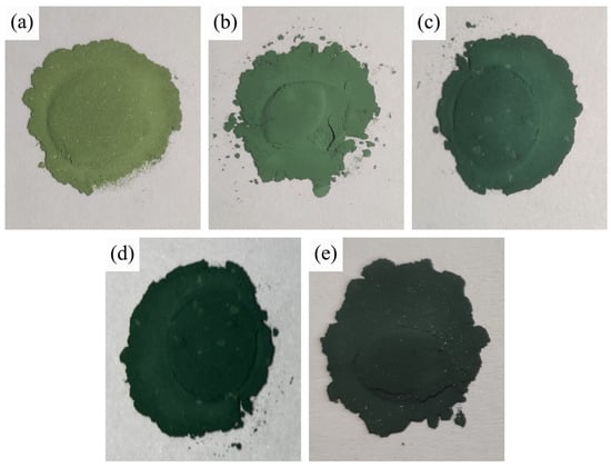 Photographs of the composite pigment powders obtained after calcination at 800 °C for samples with different Co/Ni molar ratios: (a) 0.1:0.9, (b) 0.3:0.7, (c) 0.5:0.5, (d) 0.7:0.3, (e) 0.9:0.1.
