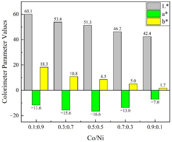 Figure 9 shows photographs of the composite pigment powders obtained after calcination at 800 °C for samples with different Co/Ni molar ratios. Figure 10 depicts the values of the colorimetric parameters of the corresponding composite pigment powders shown in Figure 9. As can be seen from Figure 9, the color of the calcined product changes from yellow-green to dark green as the Co/Ni molar ratio increases, and this trend is further confirmed by the values of the colorimetric parameters (Figure 10).