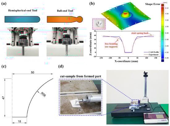 (a) Two kinds of forming tools used in the SPIF experiment; (b) scanned profile and CAD profile comparison against experiment; (c) 2D desired profile; (d) surface roughness measurement.