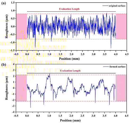 Measured surface profiles using Mitutoyo Surftest SJ-400 (a) original surface; (b) formed surface.