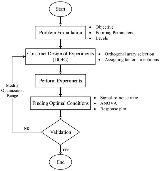 The incremental sheet forming process (ISF) technique, also known as dieless forming, is regarded as one of the flexible manufacturing technologies due to its ability to produce complicated components without using additional dies [1,2,3,4,5]. In detail, the forming process can be performed with the help of a predesigned hemispherical-end forming tool by designing the toolpath, which defines the tool motion based on the desired profiles that need to be manufactured. Due to aforementioned advantages, this process is widely adopted in industrial applications such as medical, automotive, aerospace, and civil sectors [1,2,3,4,5]. However, although this process has noticeable advantages, it also tends to have drawbacks [6,7,8,9,10], including the material formability [11] issues such as achieving proper height and wall angle, controlling thinning behavior, reducing forming force [12,13,14], and the pillow effect. Nevertheless, the significant demand still rises in this process to obtain an excellent surface finish on the incrementally formed parts. Therefore, many researchers have carried out considerable research to identify the working parameters that control achieving better surface quality [15,16,17,18,19,20]. Correspondingly, researchers [21,22,23,24,25] have also successfully exploited the Taguchi method for many engineering applications such as Fenton process optimization [21], injection molding process [22], turning process [23], laser machining process [24], electrical discharge machining process [25], and ISF process [26,27,28,29,30,31,32,33].