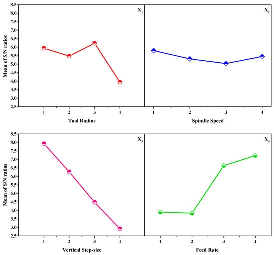 According to the highest values of the S/N ratio (Table 3), it can be concluded that minimum surface roughness could be accomplished when the vertical step-down size is smaller, the feed rate is high, and the punch tool radius is high. Based on the delta values, the process parameters rank in terms of influencing the response, surface roughness, is identified. The outcomes explain that the step-down size has a higher impact on the surface roughness, followed by feed rate and tool radius, whereas the spindle speed is noticed to affect the response moderately. Eventually, the optimum level setting was received at level 3 for tool radius, level 1 for spindle speed and step-down size, and level 4 for feed rate.