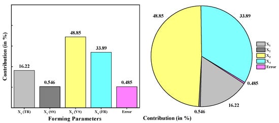 Likewise, the contribution of the forming parameters in terms of percentage is determined and detailed in Figure 6. For example, Figure 6 conveys that the vertical step-down size contributes about 49% to the response, whereas the feed rate and the tool radius contribute roughly 34% and 16%, respectively. On the other hand, the spindle speed has a contribution of approximately 0.55%, which is a nearly negligible quantity. This kind of evidence is more beneficial for selecting appropriate process parameters to improvise the response collectively.