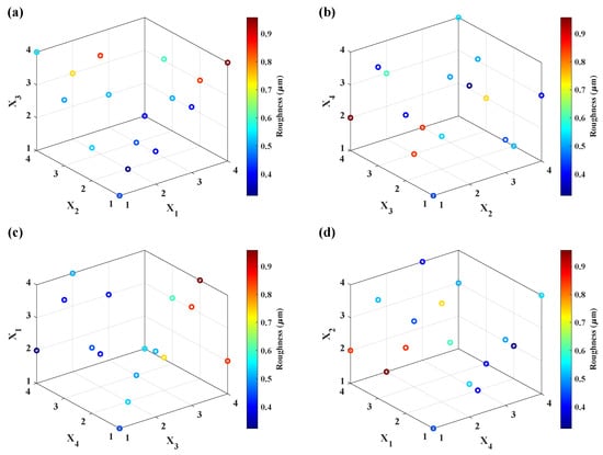 The scatter plot reveals the presence of non-linearity in the response, surface roughness, concerning the control variables in a combination of tool radius, spindle speed, vertical step-down size, and feed rate, as represented in Figure 7. Using Figure 7a–d as a guideline, the mathematical model, Equation (10), was constructed considering the forming parameter’s main and interaction effects. The constructed surface roughness (Ra) mathematical model is expressed below: