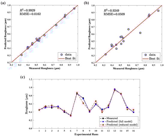 (a) Relationship plot of full model; (b) relationship plot of reduced model; (c) measured vs. predicted data of surface roughness.