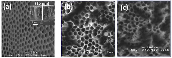 Figure 2 shows SEM images of TiO2 nanotubes decorated with Ag nanoparticles obtained with 10 min and 20 min pulse durations. The TiO2-NTs, without metallic nanoparticles, were vertically aligned on titanium substrates. These nanotubes had a diameter of around 100 nm and a length of around 15 μm (inset Figure 2a). We note the presence of small, uniformly dispersed Ag nanoparticles, and a few aggregates at the top of the nanotubes. The images show a nano-tubular structure with an average diameter of 150 nm. The Ag nanoparticles are very small in size, so they are not observable with SEM.