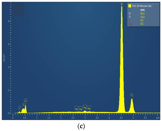 EDX spectra of TiO2 nanotubes decorated with silver nanoparticles: (a) undecorated TiO2-NTs, (b) 10 min Ag-NPs/TiO2-NTs, and (c) 20 min Ag-NPs/TiO2-NTs.