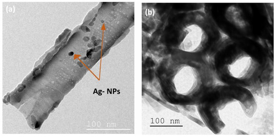 The TiO2-NTs adorned with Ag-NPs were examined by TEM (Figure 4) to verify the presence of Ag-NPs in the TiO2-NTs. A drop of Ag-NPs/TiO2-NTs dispersed in solution was applied to the TEM holey carbon grids.