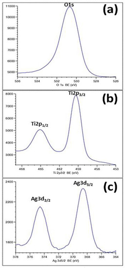 As can be seen in Figure 6, the formation of Ag species was confirmed by the XPS results. Figure 6a exhibits an O1s peak at 530.8 eV, attributed to the oxide. The appearance of the Ti-2p peak position at a binding energy of 459 eV (Figure 6b) proved that the main chemical valence of Ti is +4. This finding corroborates the assigned values for anatase TiO2 in the NIST database. Figure 6c shows the typical XPS signature of the Ag 3d doublet (3d5/2 and 3d3/2) taken from the surface of the TiO2-NTs decorated with Ag-NPs. The signals at 374.3 and 368.3 eV are attributed to Ag 3d3/2 and Ag 3d5/2 of Ag-NPs, respectively.