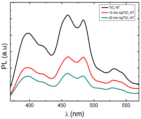 The photoluminescence (PL) of TiO2-NTs can inform us about the lifespan and transport of photogenerated charges. Figure 7 shows the photoluminescence spectra of pure TiO2-NTs decorated with Ag-NPs. The peak located at 365 nm (3.4 eV) is attributed to the electron transition between the valence and conductive bands of TiO2. The peaks present at 459 nm, 483 nm, and 531 nm are attributed to the oxygen vacancies present on the surface of TiO2 [27,28].
