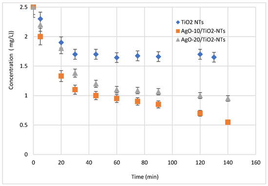The photocatalytic performances of Ag-NP/TiO2-NT catalysts were estimated by photocatalytic degradation of the antibiotic under visible light irradiation at ambient temperature. Figure 8 shows the pollutant removal using Ag-NPs/TiO2-NTs decorated by photoreduction for 10 and 20 min. It is seen from Figure 8 that the pollutant removal was pertinently affected by the different decoration times. In this test, it is readily seen that the concentrations of pollutants decreased over time under visible light irradiation. Moreover, a decoration of Ag in 10 min increased the pollutant removal from 35% to 80% of the initial concentration of 2.5 mg/L. This enhancement is related to the availability of the generated active sites at the interface of the catalyst deposited at 10 min [30]. However, the pollutant degradation will tend to be limited at high time values, because these values are too high to form multiple layers of catalysts, thus generating different ions and charges, which leads to distinguished charges at the interfaces of thin films and coverage of all TiO2-NTs.