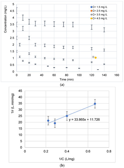 A representation of the change in concentration over time for four initial concentrations is shown in Figure 9a. As was observed, the increase in the concentration generally favors the pollutant degradation.