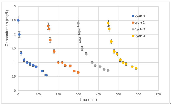 After each degradation cycle, the 10 min Ag-NPs/TiO2-NTs were well washed and reused. The photocatalytic findings of repetitive use (four cycles) of the 10 min Ag-NP/TiO2-NT photocatalyst are shown in Figure 10. Figure 10 shows no loss of sample photoactivity. These results prove the overall potential of the 10 min Ag-NP/TiO2-NT catalyst for water treatment applications. Generally, the same slope is noted in each cycle. Consequently, these results shown below prove the availability of active sites and the excellent photocatalytic stability of this catalyst.