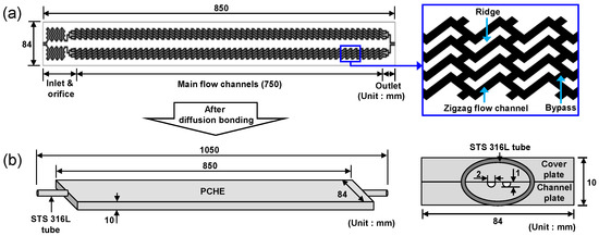 The PCHEs were manufactured using a photochemical etching and a diffusion bonding process. Flow mini-channels were etched into an STS 316L plate with a size of 84 (W) × 850 (L) × 5 (T) mm. Figure 1a shows the geometry of the flow channels. The flow passages were designed in two symmetrical shapes in the longitudinal direction, and one unit flow passage consisted of a feedwater inlet, an orifice, main flow channels with a zigzag-shape, and a steam outlet. All cross-sections of the etched flow channels had a semicircular shape with a diameter and height of approximately 2 mm and 1 mm, respectively. The channel plate was then diffusion-bonded without inserting an interlayer with an STS 316L cover plate with the same dimensions as the channel plate at a temperature of 900 °C and a pressure of 10 MPa for 60 min, which corresponds well with similar diffusion bonding parameters for this material [32]. Subsequently, STS 316L tubes, which will serve as a header, were welded to the inlet and outlet of the PCHE. A schematic diagram of the finally manufactured PCHE is shown in Figure 1b.
