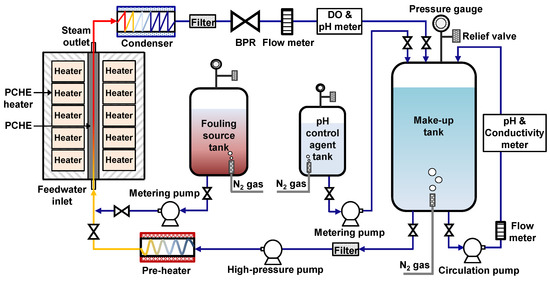 Figure 2 is a schematic diagram of a water-steam circulation loop system used for the PCHE fouling tests. The fouling tests were performed for 500 h each using two fresh PCHEs under the thermal hydraulic parameters and water chemistry conditions given in Table 1. These thermal hydraulic parameters correspond with the operating conditions of a small modular reactor, named SMART (System-integrated Modular Advanced ReacTor) [33,34,35].