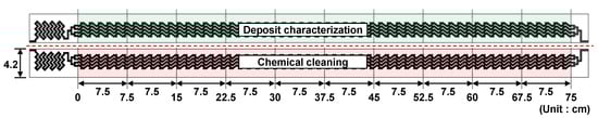 On the other hand, after the second fouling test, the full-length PCHE was used for chemical cleaning without sectioning. As shown in Figure 4b, the chemical cleaning solution was fed into the PCHE inlet at a flow rate of about 30 mL/min by a circulation pump and the temperature of the solution was maintained at 93 °C by the heaters and a hot plate. The chemical cleaning was performed for a total of 42 h, and sampling was periodically conducted to measure the iron concentrations dissolved in the cleaning solutions. After sampling, the cleaning solution was always replaced with a new one.