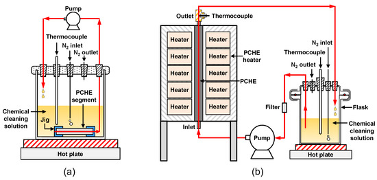 Schematic diagrams of the chemical cleaning apparatus: (a) circulation cleaning for a PCHE segment; (b) circulation cleaning for a full-length PCHE.