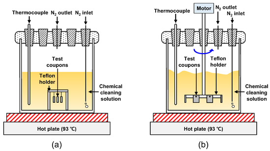 The corrosion of the PCHE material, which may occur during chemical cleaning, was evaluated from the weight change of corrosion coupons in the EDTA-based solution at 93 °C. All of the coupons were polished using 100 grit silicon carbide paper to simulate the actual surface roughness of the PCHE flow channels (average roughness (Ra) = 1.38 µm). As shown in Figure 5, the tests were conducted under two different conditions. For the stagnant immersion test, corrosion coupons were placed on a Teflon holder. The test under the flowing condition was designed to simulate corrosion during the solution circulating cleaning. Coupons were mounted on a Teflon holder with a regular dodecagonal shape and the holder was rotated using a motor. From the angular velocity, the flow rate of the solution at the surface of the specimens was controlled to be 6 m/min, analogous to that of the circulating cleaning for the full-length PCHE. The weight change was periodically measured using an electrical balance with a readability of 10 µg. The surfaces of the coupons were also examined using SEM to compare the corrosion behavior before and after the chemical cleaning process.
