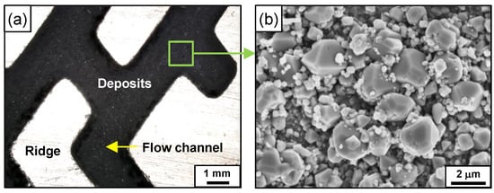 Figure 6 shows optical and SEM images of the flow channel surfaces after the fouling test. The surfaces of the flow channels were entirely covered with black-colored deposits. The deposits consisted of polyhedral particles with various sizes from tens of nanometers to about 2 μm and were accumulated so densely that the original surface of the flow channels could not be observed.