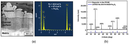 Chemical composition and crystal structure of the deposits within the PCHE: (a) STEM image and EDS spectra, and (b) XRD patterns.