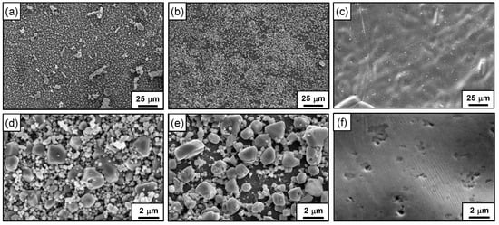 SEM micrographs of the PCHE flow channel surfaces: (a,d) before chemical cleaning; (b,e) after the first step cleaning for 12 h; (c,f) after the second step cleaning for 12 h.
