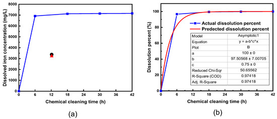 (a) Change in the iron concentrations dissolved from the full-length PCHE with cleaning time under the circulation condition. The solid black circle and red triangle denote the iron concentration dissolved in the first and second step, respectively. (b) Derivation of the empirical equation of dissolution percent using the dissolved iron concentration change curve with time.