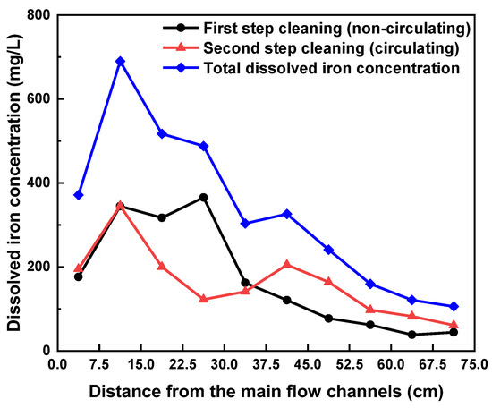 Iron concentrations dissolved from the main flow channels during the two-step cleaning process.