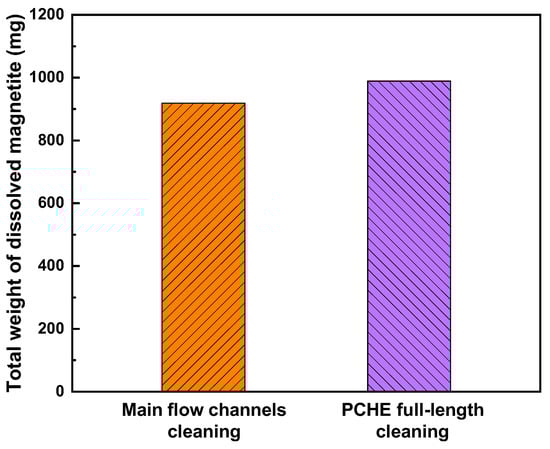 The iron concentration in the cleaning solution results from the dissolution of magnetite deposits. Therefore, the amount of magnetite deposits can be calculated using the dissolved iron concentration and solution volume. Figure 11 shows the total weight of the magnetite dissolved during the full-length cleaning (Figure 9a) and main flow channel cleaning (Figure 10), respectively. The deposit amount removed from the full-length PCHE was approximately 7% greater than that from the sectioned channels, and the reason for that can be discussed as follows: despite all of the precautions, a proportion of the deposited particles were inevitably detached from the channel surfaces during the PCHE sectioning process. In addition, the value of the sectioned channels was obtained only from the segments of the main flow channels, except for the PCHE inlet and outlet sections (Figure 3).