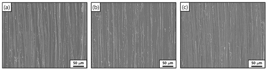 SEM micrographs of the STS 316L corrosion coupon surfaces: (a) before the corrosion test; (b) after the corrosion test under the stagnant condition for 42 h; (c) after the corrosion test under the flowing condition for 42 h.