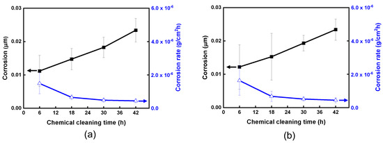 The corrosion increased with cleaning time, but the values were extremely low, at about 0.02 μm, even after 42 h. It was also confirmed that the corrosion was not affected by the solution flow. According to the EPRI guidelines [36], the allowable corrosion limits are 254 μm for low alloy steels and 6 μm for Alloy 600 tubing in the classic PWR SGs during a chemical cleaning period. This indicates that the chemical cleaning method using an EDTA-based solution can be implemented for fouled PCHEs within well-controlled base metal corrosion. Furthermore, it is confirmed that all of the iron ions dissolved in the cleaning solution resulted from the dissolution of the deposits formed on the PCHE channel surfaces during the cleaning process.