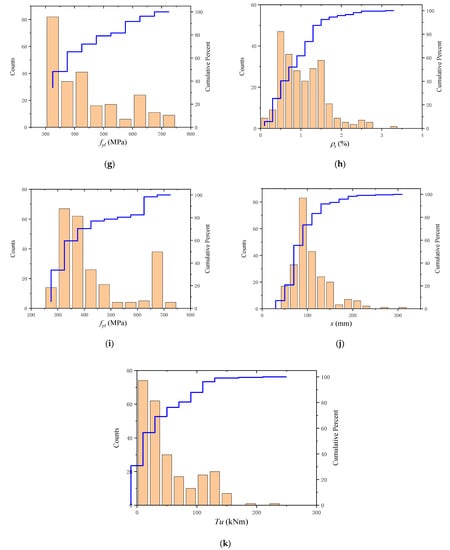 A high-accuracy BP neural network requires a large amount of data to train the model and test the model with new data samples. Since the experimental data on the torsional strength of the RC beam are limited, it is necessary to make adequate use of the available data for each parameter in order to improve the accuracy of the model. Liu [18] mentioned that BP neural network models need to consider the relative parameters of the actual problem. Additionally, according to [13,26,27], in a neural network model for predicting the strength of RC beams, a few input neurons can make the network fitting process more complex and difficult, or even fail. Therefore, in this paper, 11 different parameters of RC beams were selected, which include the RC beam section (the width ( b ), depth ( h )), closed stirrup (width ( b ), depth ( h ), spacing ( s )) compressive strength ( f c ), yield strength of the longitudinal reinforcement ( f y l ), longitudinal reinforcement ratio ( ρ l ), yield strength of transverse reinforcement ( f y t ), transverse reinforcement ratio ( ρ t ) and torsional strength ( T u ). The detailed information of the dataset used in this study is shown in Table 1 and Figure 1, respectively, which are collected from references [2,3,17,27,28,29,30,31].