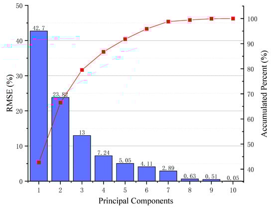 In general, the inputs of the neural network should have small correlations between themselves. A number of the strongly correlated coefficients can lead to worse predictions of the BP neural network model, if all 10 variables are employed as inputs in this research. This is a result of the possible strong correlation of variables. Campbell and Atchley [32] suggested using the mathematical tool principal component analysis (PCA) to reduce the number of correlated variables and transform the correlated variables in the dataset to uncorrelated variables. Furthermore, PCA revealed the importance ranking of the newly generated 10 principal components (PCs). The PCA results are shown in Table 2. The first seven PCs are sufficient to represent approximately 99% of the information in the original dataset. Therefore, these seven PCs were selected as the inputs of the BP neural network. Although the number of model inputs is reduced, the quality of the data can be improved due to non-correlation, as shown in Figure 2.