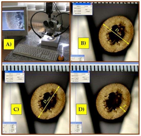 A stand equipped with a Hund WETZLAR stereoscopic microscope (Helmut Hund GmbH, Welzlar, Germany) with a built-in Panasonic GP-KR222E digital camera was used to determine the geometric dimensions of the miscanthus stalk cross-section (minimum diameter Dmin, maximum diameter Dmax and wall thickness g—Figure 1B). The recorded image using the DigiLab 4.5 program (DigiLabs Inc., Palo Alto, CA, USA) was generated on a computer screen and recorded in jpg format (Figure 2A). For the obtained photos, the dimensions of the stalk cross-sections were measured using the Multiscan v. 14.96 program (Computer Scanning System, Warsaw, Poland) (Figure 2B–D). Before starting the measurements, the image was scaled by marking two points on the linear gauge scale visible on the image and assigning it a specific length unit. A Stainless Hardened electronic caliper with the accuracy class L = 0.1 mm was used to measure the height L of the samples for compression tests.