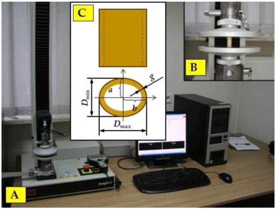 Stand for testing the static compression test: (A) MTS testing machine; (B) static compression attachment; (C) characteristic dimensions of the miscanthus stalk cross-section: Dmin—minimum stalk diameter, Dmax—maximum stalk diameter, g—stalk wall thickness, a—the length of the semi-minor axis of the ellipse, b—the length of the semi-major axis of the ellipse.