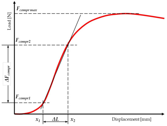 It was assumed that the cross-section of miscanthus stalk has the shape of an ellipse, with the ellipse being hollow in the center. The measurement of force and displacement on the MTS testing machine is performed automatically. The program searches the graph (Figure 4) for points that correspond to the initial force (Fcompr1) and the basic force (Fcompr2), above which the load–displacement relationship (displacement) loses its linear characteristic. In order to determine the modulus of elasticity (MOEcompr), a mathematical formula is entered into the program.