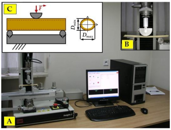 The next step was to calculate the load capacity of the stalk, expressed as the maximum stress, corresponding to the failure of the test specimen using the bending test (Figure 5). The load capacity was calculated from the equation [69,76,77]: