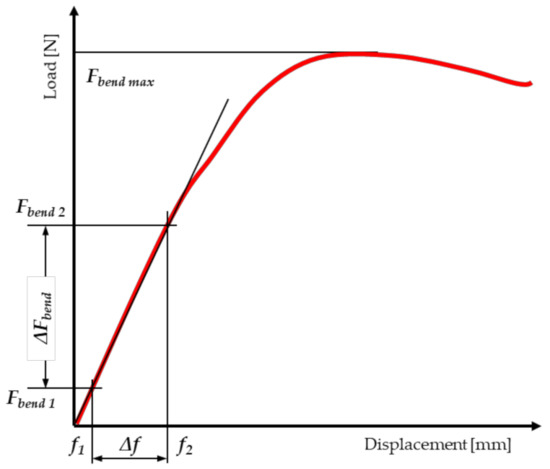 The modulus of elasticity for bending (MOEbend) was determined, similarly to compression, using the load–displacement relationship obtained from the MTS testing machine (Figure 6).
