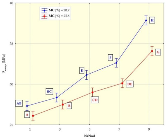 The static axial compression tests of the stalks along the fibers were performed in replicates of 15 for each of the five internodes (NrNod = 1, 3, 5, 7 and 9) and for each of the two moisture contents ( = 20.7% i = 25.8%).