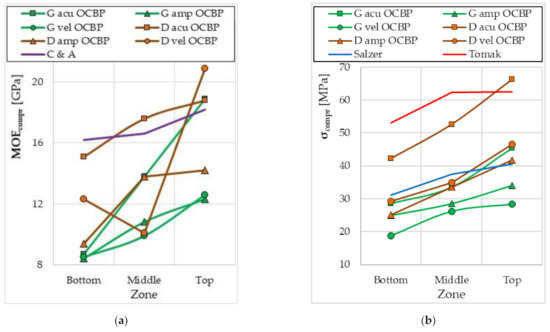 The average values of the modulus of elasticity obtained are in the range from 610 MPa to 930 MPa (for compression) and from 1948 MPa to 2858 MPa (for bending). On the other hand, the average values of the maximum stress range from 26.1 MPa to 37.9 (for compression along the fibers) and from 58.3 MPa to 137.8 MPa (for bending).