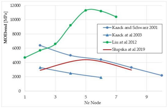 So far, there are no results of research on the biomechanical parameters of giant miscanthus stalks taking into account both the influence of moisture content and the internode from which the samples were taken. Only a few research teams independently analyzed MOE bend changes depending on the internode number (Table 1).
